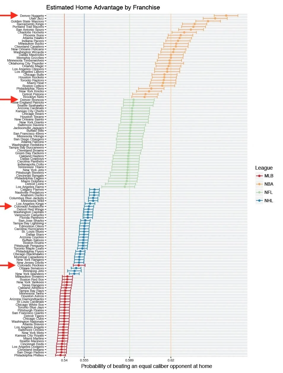 Chart showing American major league teams' estimated home advantage. Denver teams are marked with a red arrow. Source: MSU Denver