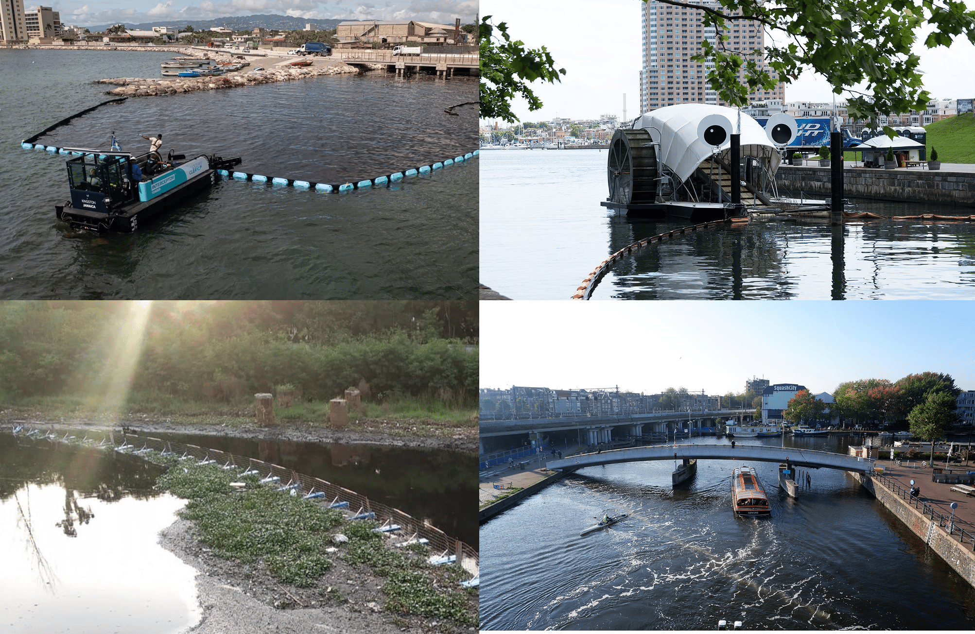 River cleanup solutions in action. Top left: The Ocean Cleanup "Interceptor". | Top right: "Mr. Trash Wheel" by Matthew Bellemare is licensed under CC BY-SA 2.0. | Bottom left: AlphaMERS floating stainless steel barrier. | Bottom right: "Bubble Barrier Amsterdam" by The Great Bubble Barrier is licensed under CC BY-SA 4.0.