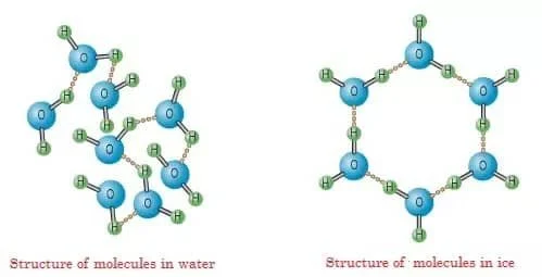 Compare the disorderly water molecules (left) to the orderly ice molecules (right).